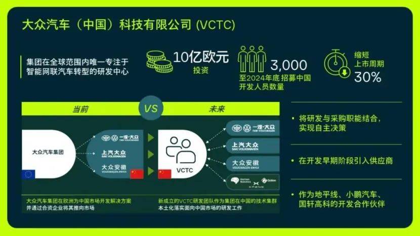 为了在产品开发初期提高速度、优化成本结构,车辆和零部件的开发与采购被有效整合,据悉合肥中心已联合合资公司上汽大众、一汽-大众、大众安徽以及国轩高科(电池)、小鹏汽车(电动化)进行共同研发。