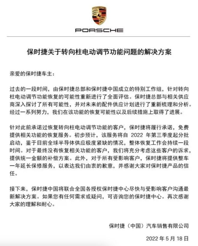事情起因是保时捷车主发现交付的新款车型并没有配备官网上标配的电动转向柱,而是被“减配”成了手动转向柱,属于典型的“货不对板”。随后,官方发布了《保时捷中国致车主的一封信》进行了致歉回应,并将原因归咎于全球性半导体产能的短缺。草草回应加之舆论发酵,保时捷品牌形象在国人心中下降,成为销量下滑关键因素。