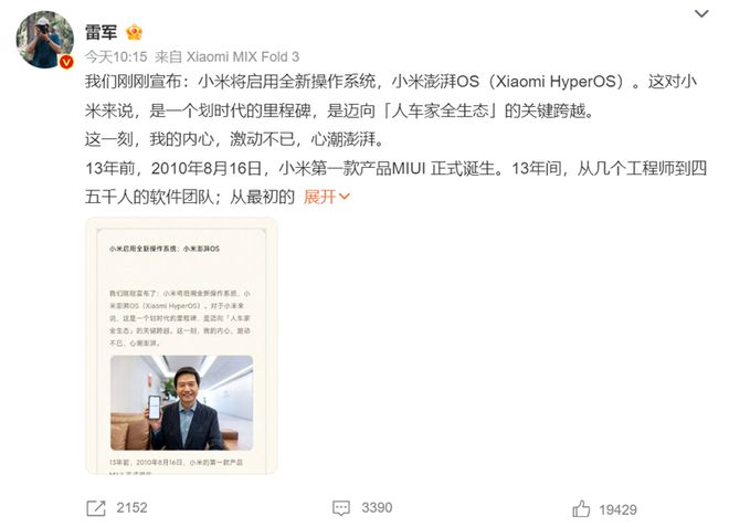 汽车信息网10月18日讯 10月17日上午,小米创始人雷军在微博上正式宣布小米将启动全新操作系统,小米澎湃OS(Xiaomi HyperOS)。据悉目前小米澎湃OS正式版已完成封包。与此同时,雷军还表示小米14系列将会是第一款搭载新系统的手机,已交付工厂开始生产。并且从这一刻起,小米澎湃OS将逐步接替 MIUI。