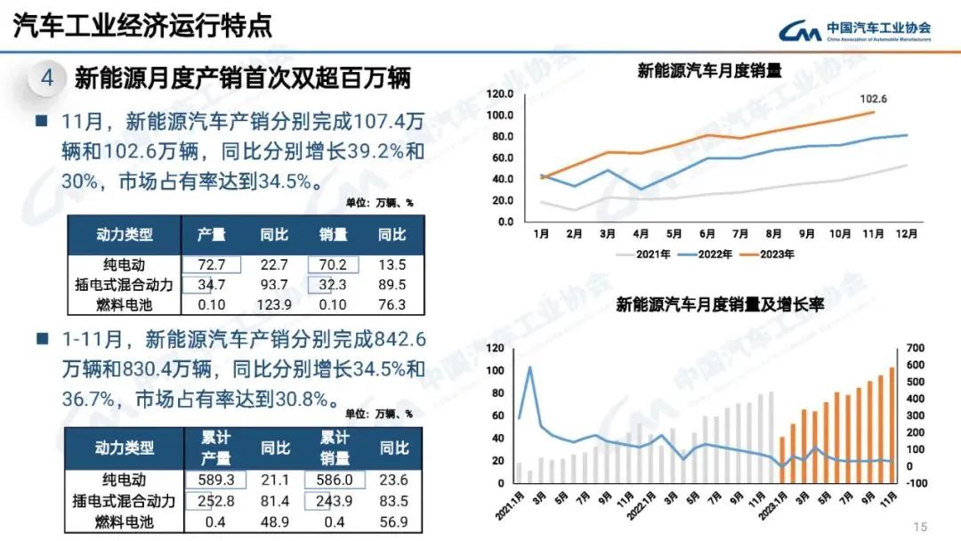 11月,新能源汽车产销分别完成107.4万辆和102.6万辆,同比分别增长39.2%和30%,市场占有率达到34.5%。1-11月,新能源汽车产销分别完成842.6万辆和830.4万辆,同比分别增长34.5%和36.7%,市场占有率达到30.8%。