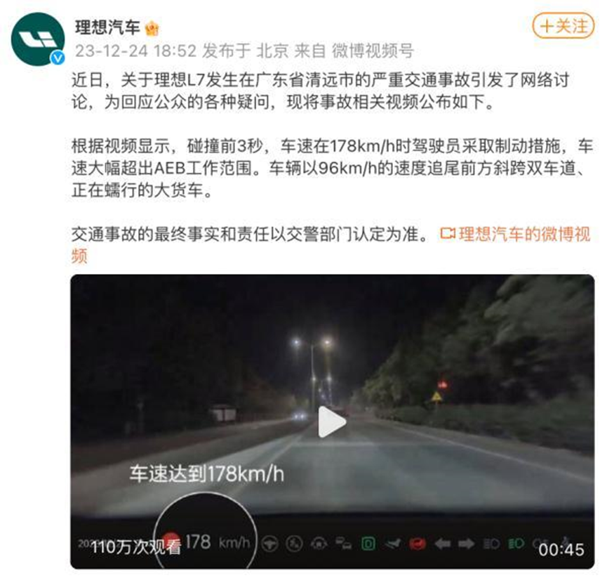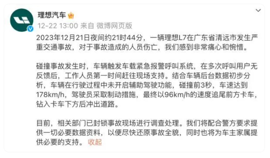 就在警方发出正式的情况通报之前,理想汽车却先一步在社交媒体上发布了事故回应:“一辆理想L7在广东省清远市发生严重交通事故,对于事故造成的人员伤亡,我们感到非常痛心和惋惜。结合车辆后台数据初步分析,车辆在行驶过程中未开启辅助驾驶功能,碰撞前3秒,车速达到178km/h,驾驶员采取制动措施,最终以96km/h的速度追尾前方卡车,钻入卡车下方后冲出道路。目前,相关部门已封锁事故现场进行调查处理。我们将配合警方要求提供一切必要数据资料,以便尽快还原事故全貌,同时也将为车主家属提供必要的支持。”
